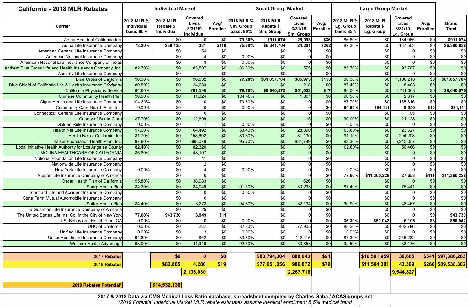 As for next year, I'd keep an eye on Health Net and L.A. County, where they're likely to see at least a few million in 2019 MLR rebates (potentially up to $14 million statewide):