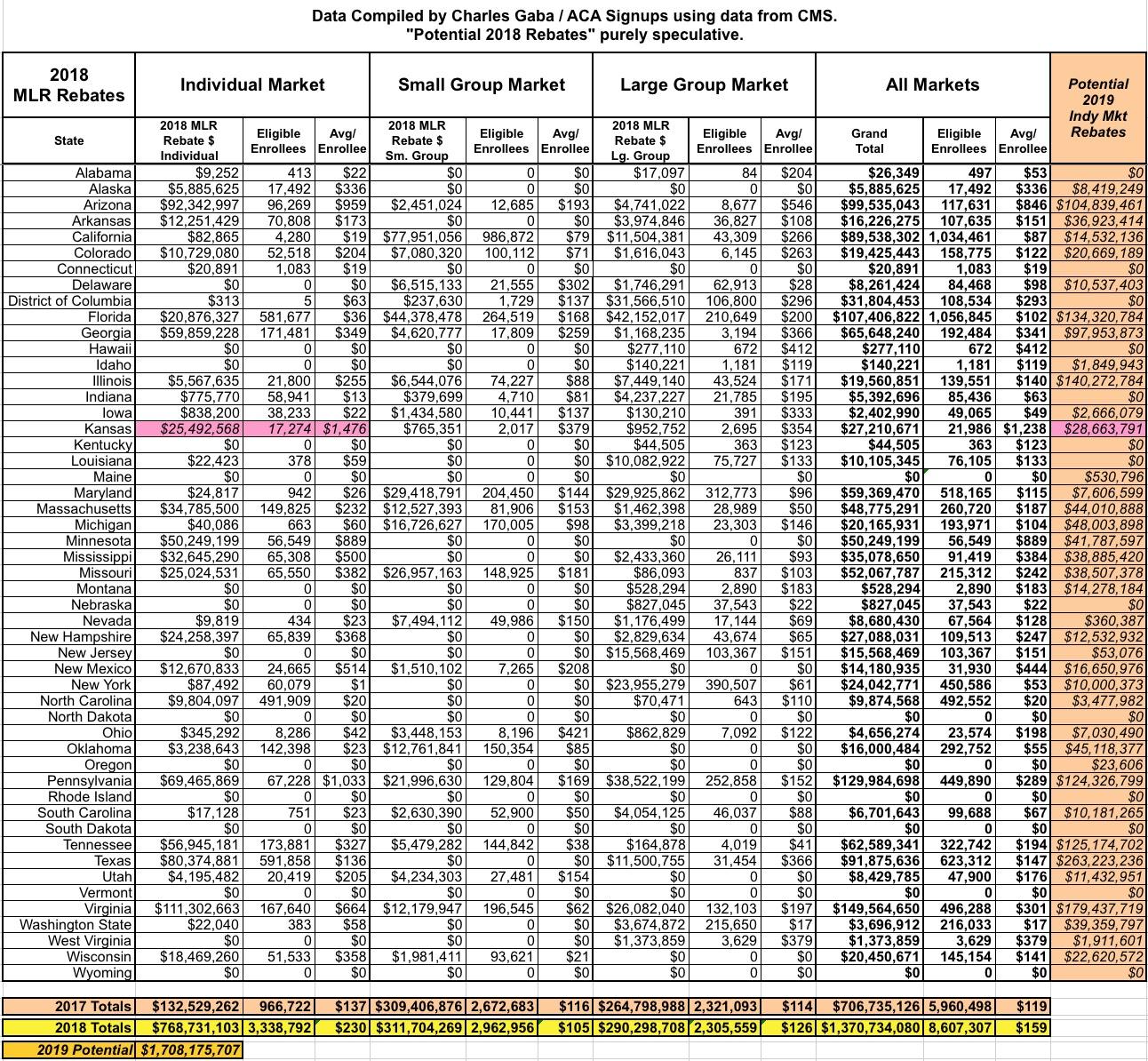 There's a bunch of other wonky stuff as well, but this post is getting pretty long already, and I'm getting a bit sick of writing about it, to be honest, so without further ado, here's the table aggregating all fifty states (+DC) and all three markets into a single table. I've also included a column listing my crude projection for potential 2019 MLR rebates on the right side.