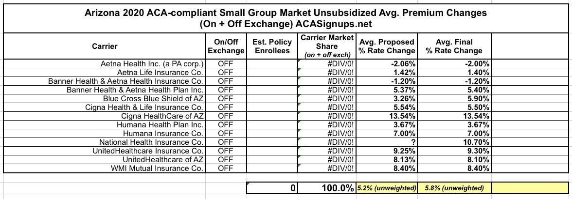 Back in early August, I ran the preliminary average unsubsidized 2020 individual market rate changes in Arizona. At the time, I had the requested rate changes for both the individual and small group markets, but not the actual enrollment numbers for each carrier, so I had no way of calculating the weighted average. I instead settled for a simple unweighted average, which came in at around a 2.4% reduction in premiums on the individual market and a 5.2% increase on the small group market.
