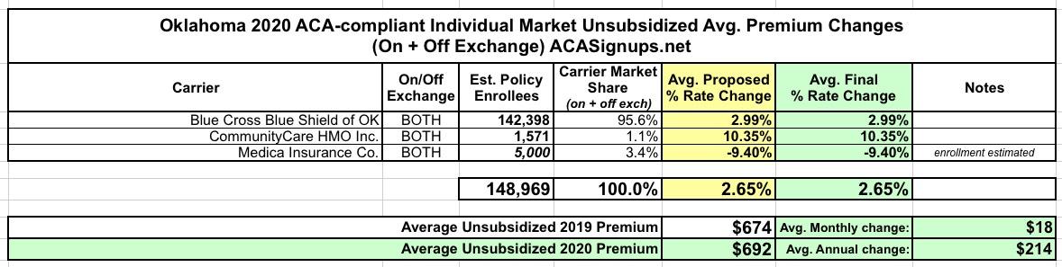 Oklahoma: *Final* avg. unsubsidized 2020 #ACA premiums: 2.7% increase