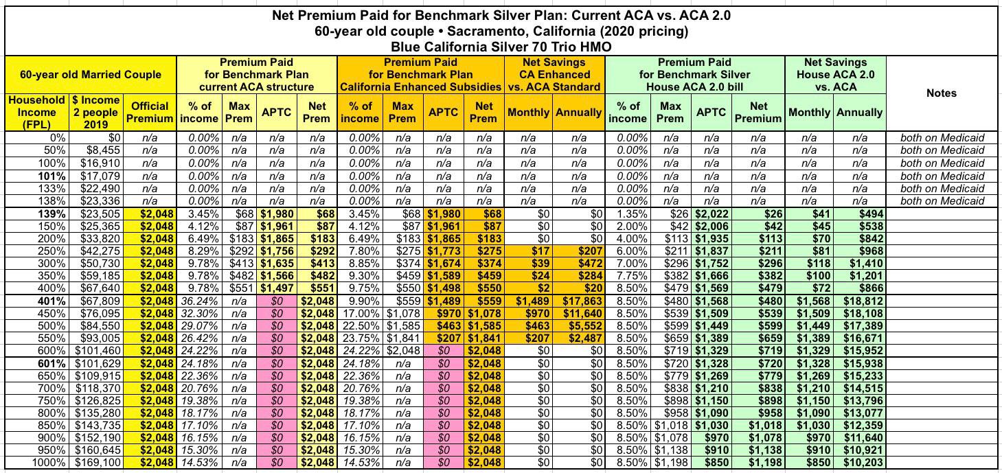 Under the official ACA structure, the total cost for both would be limited to no more than between $68 and $551/month between 138 - 400% FPL...after which it would immediately jump to the full $717/mo, or over $8,600/year. Under California's expanded subsidies, however, they'd receive additional savings of as much as $472/year between 250 - 400% FPL...and as much as $1,891 between 400-450%.