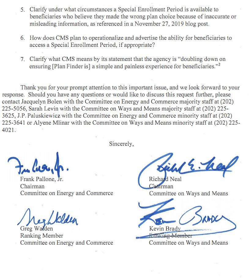 "We strongly urge you to immediately examine these concerns, and evaluate and correct, as necessary, errors with the Plan Finder tool identified by consumer advocates," Pallone, Walden, Neal and Brady continued in their letter. "Additionally, given that Medicare Open Enrollment has now closed, CMS must ensure that beneficiaries who may have relied on Plan Finder to make these decisions are held harmless. These beneficiaries should be included in a Special Enrollment Period so they can make changes to their plan selection despite the close of the Medicare Open Enrollment Period at this point."