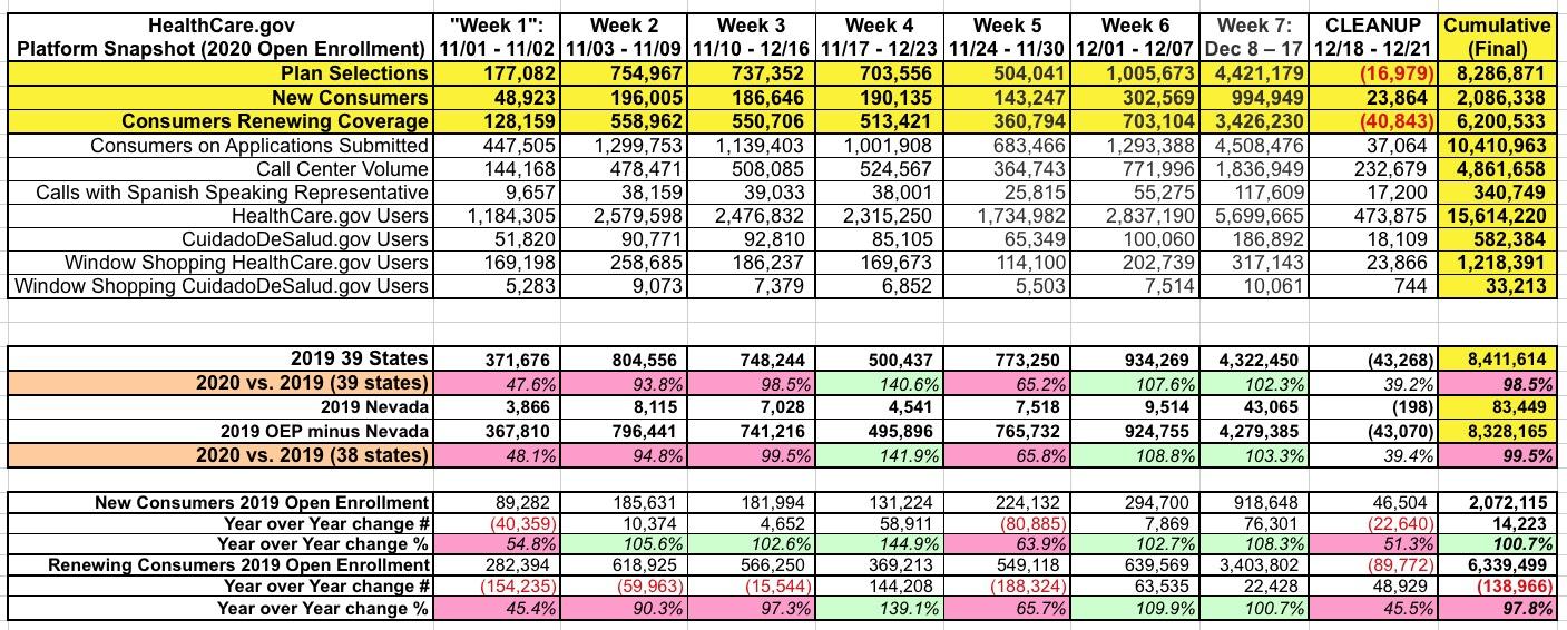 Here's how it broke out for each week, including the final "cleanup" period, including comparisons for each with the 2019 Open Enrollment Period (click image for high-res version):