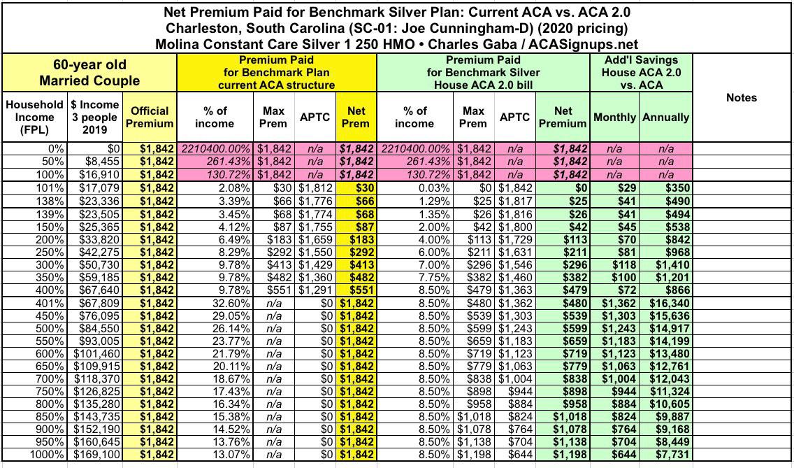 Under ACA 2.0, again, they'd pay no more than 8.5% in premiums, reducing their net premiums from $1,842/month down to as little as $480/month, a reduction of a whopping $1,362/month or over $16,300/year.