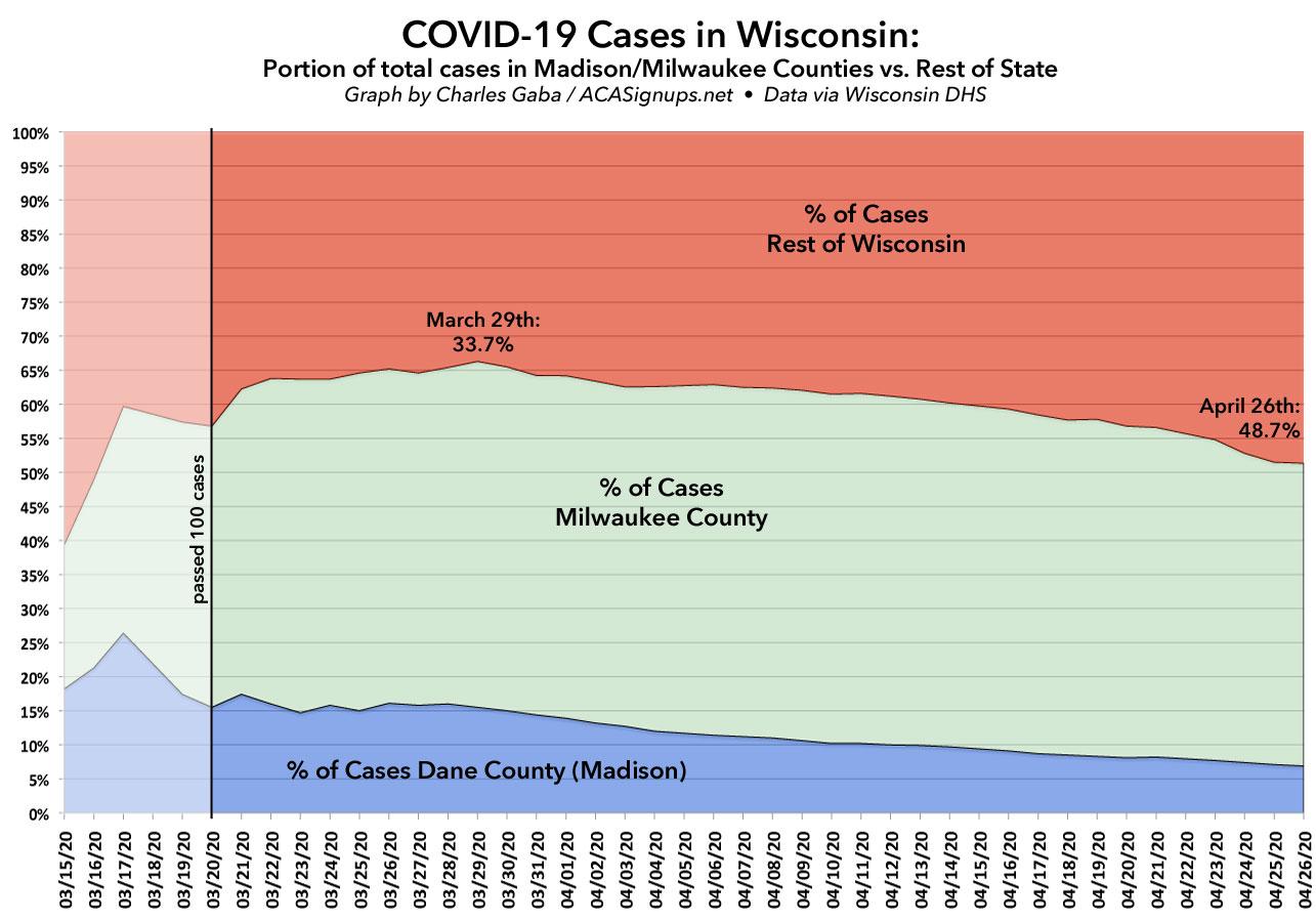 For Wisconsin, I used Dane County (Madison) and Milwaukee County (Milwaukee). This isn't an exact representation since these cities only make up about 50% and 60% of the county populations respectively, but I don't have the daily city-level data available for either one: