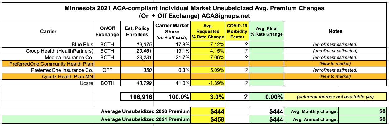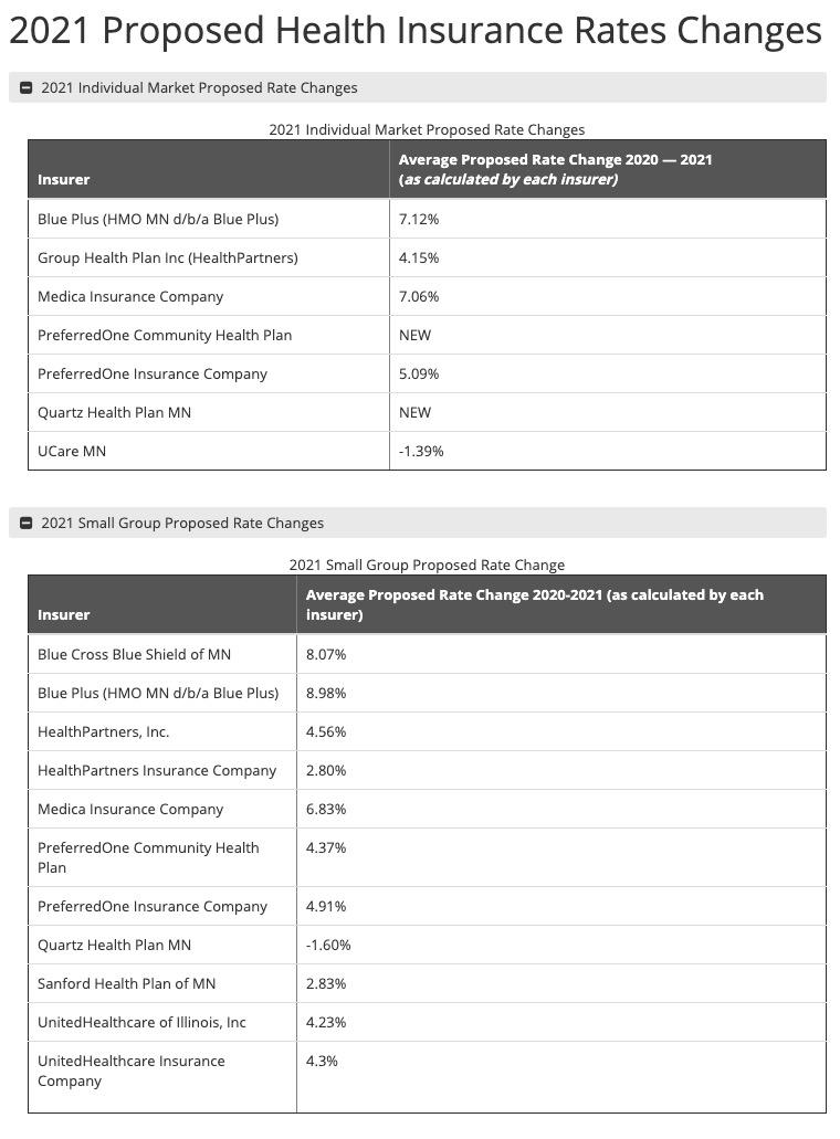 The good news out of Minnesota is that the Commerce Dept. has published the preliminary 2021 average rate changes for both the individual and small group markets in a simple table.