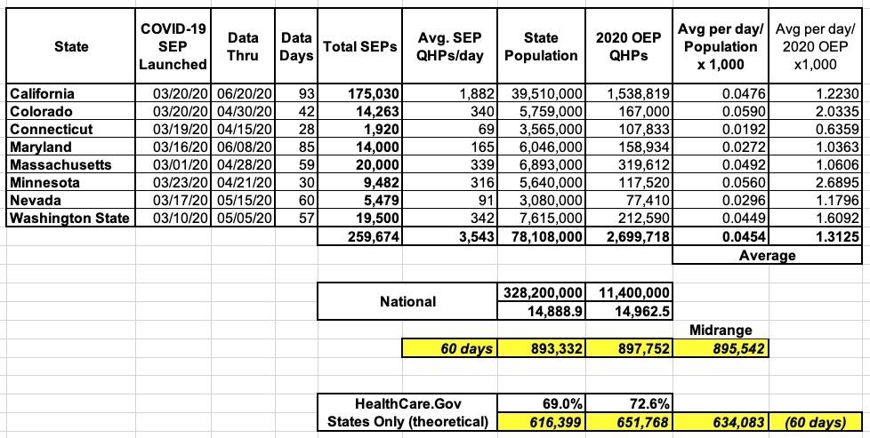 Muddying the waters a bit is the fact that while the vast bulk of the numbers above only include COVID-19-specific SEP enrollments, in a few states they may include all Special Enrollment Period enrollees (i.e., the normal life changes like moving, getting married/divorced, turning 26, and so forth). On top of this, the start and end dates of the COVID-19 SEPs have varied (some of them are still ongoing). Also, in California, they already happened to have an "open" SEP happening prior to the COVID pandemic hitting anyway; total non-COVID SEP enrollment in CA to date this year is around 67,000 other people. Meanwhile, Maryland had a unique SEP for residents who haven't filed their state taxes yet.