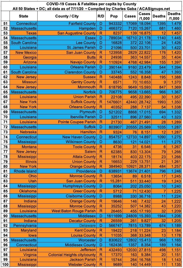Here's the top 100 counties ranked by per capita COVID-19 fatalities as of Saturday, July 18th (click image for high-res version):