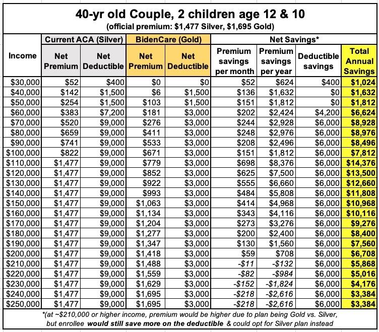 I've spent a LOT of time running analyses of how much different households would save under the House ACA 2.0 bill...but I have to modify those numbers for Biden's plan, since he's also proposing upgrading the benchmark plan from Silver to Gold (plus, the version of the House bill which actually passed had a different formula than their prior version anyway).