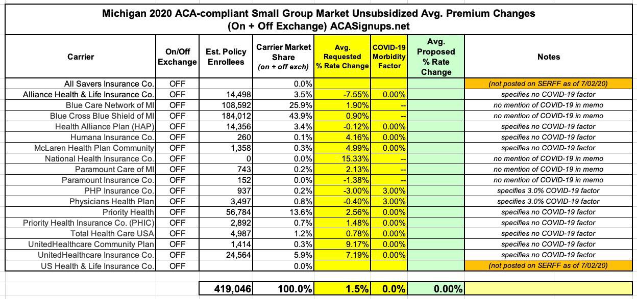 It's also worth noting that neither All Savers nor US Health & Life are listed in the SERFF database as of today, although it's possible that they simply dropped out of Michigan's small group market (last year All Savers only had 14 enrollees, though US Health did have over 2,400):
