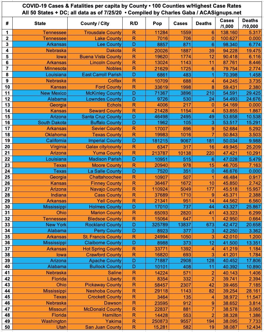 Here's the top 100 counties ranked by per capita COVID-19 cases as of Saturday, July 25th (click image for high-res version):