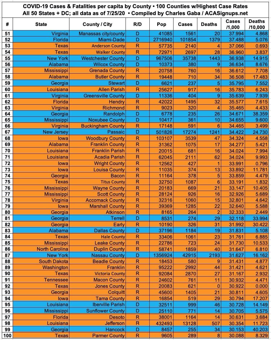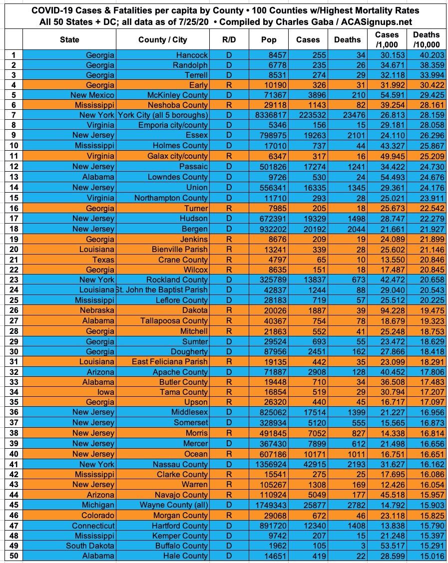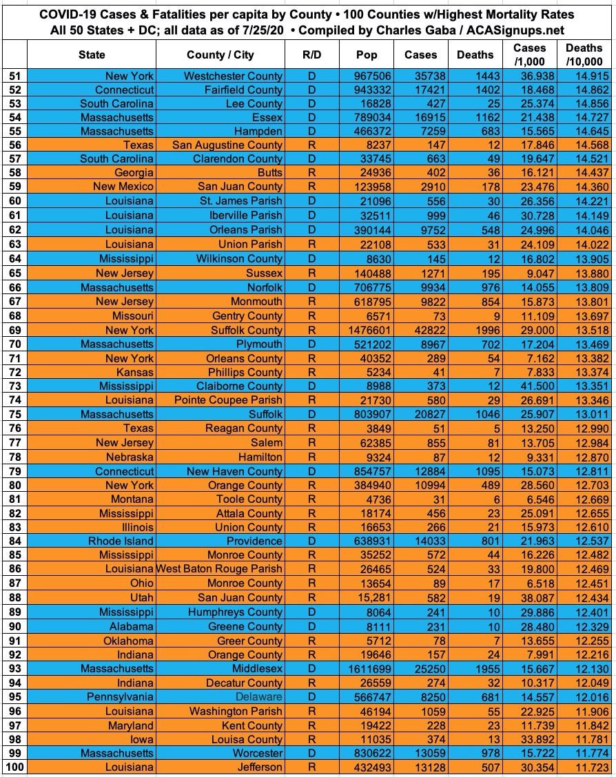 Here's the top 100 counties ranked by per capita COVID-19 fatalities as of Saturday, July 25th (click image for high-res version):