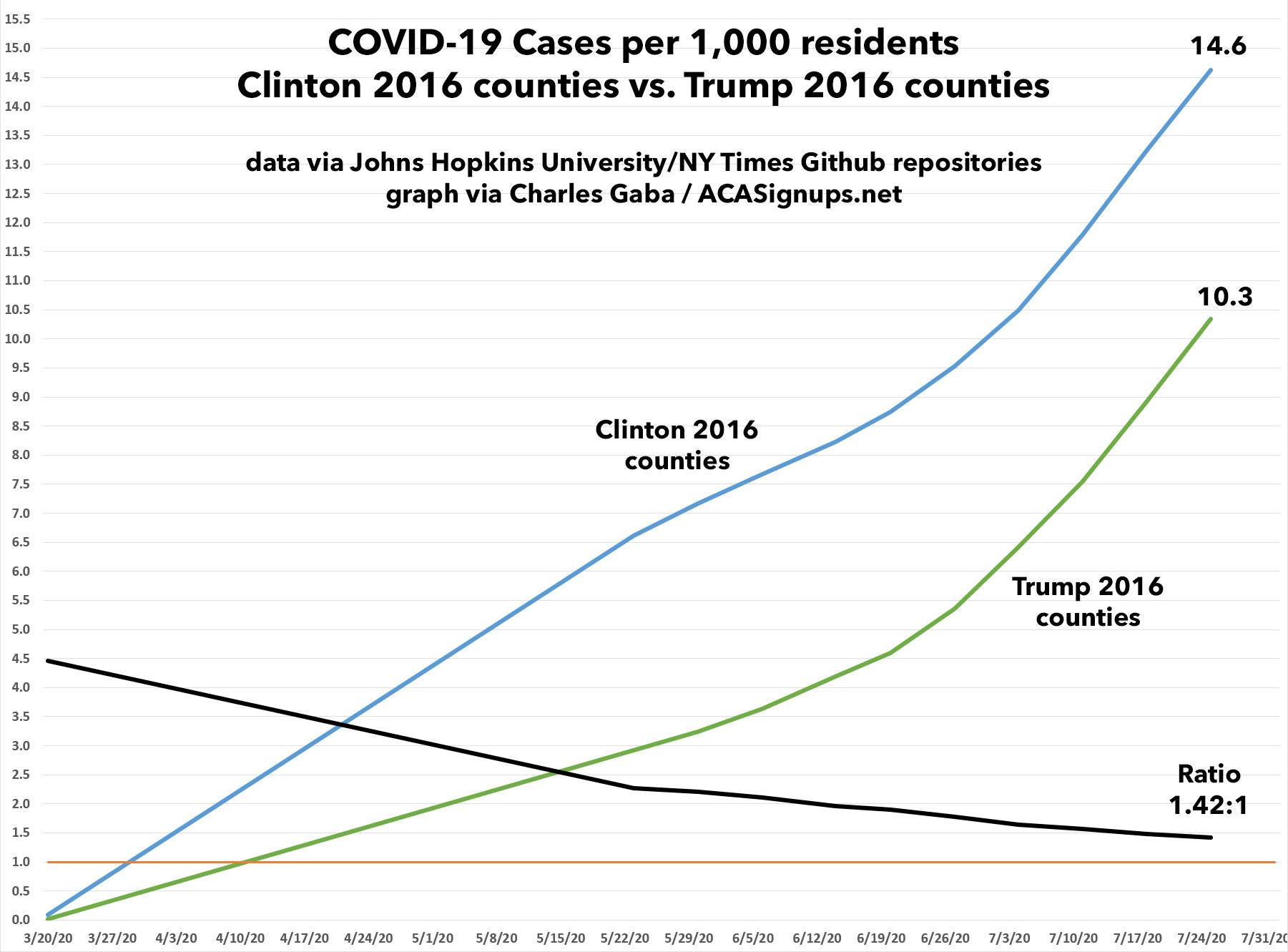 It's also worth noting how the ratio of per capita cases has shifted between the Clinton and Trump counties over time. Back in mid-March, the rate was 4.5x higher in Clinton-voting counties than Trump counties. As of this weekend that ratio was down to 1.6x. In terms of the mortality rate, the ratio has dropped from 5.3x to 2.7x.