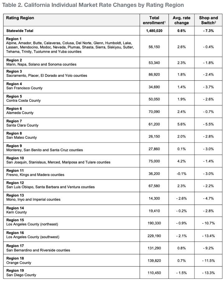 The preliminary average rate change of 0.6 percent varies by region and by an individual’s personal situation (see Table 2: Covered California Rate Changes by Rating Region).