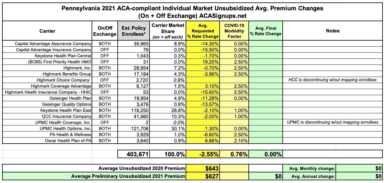 Pennsylvania: Preliminary avg. 2021 #ACA premiums: -2.6% indy market, +2.3% sm. group