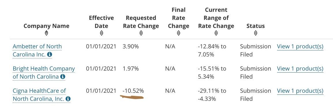 UPDATE: (sigh) Louise Norris called attention to what appears to be an important typo in the NC DOI PDF above...this objection letter/response buried in the SERFF database certainly makes it look like Cigna is actually requesting a 10.5% reduction in their 2021 premiums, not a 10.5% increase. Adding to the confusion, the response to the letter makes it look like they're actually asking to drop rates 14.3%...
