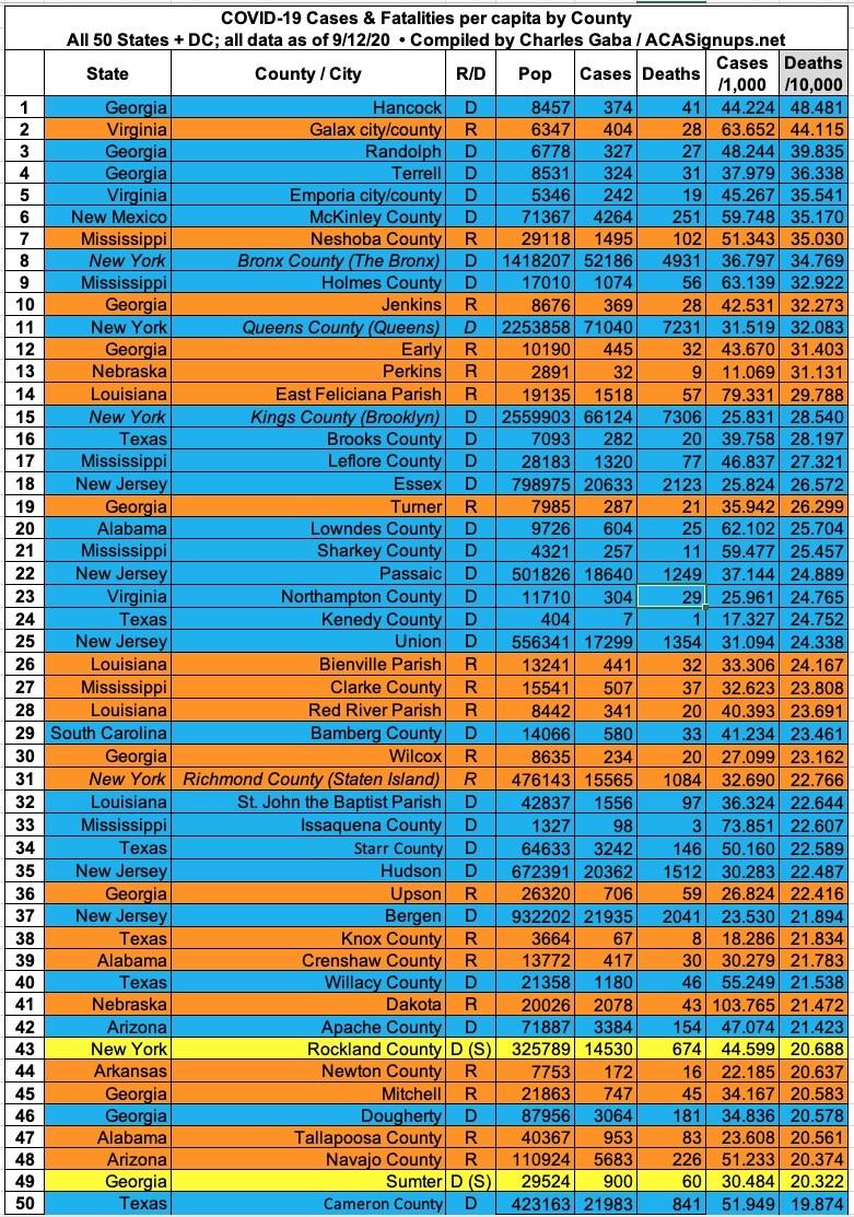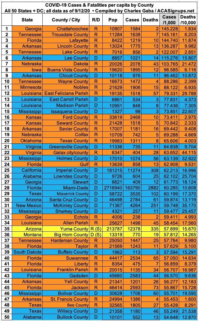 With these updates in mind, here's the top 100 counties ranked by per capita COVID-19 cases as of Saturday, September 12th (click image for high-res version). Blue = Hillary Clinton won by more than 6 points; Orange = Donald Trump won by more than 6 points; Yellow = Swing District