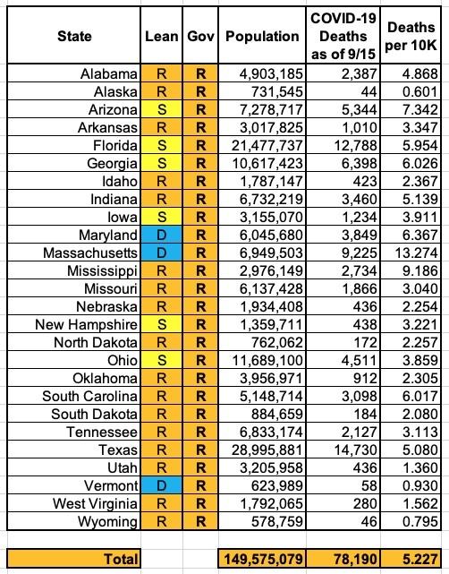 I don't have the historic data to run a graph over time, but here's what the "Blue State/Red State" COVID-19 death rates look like as of mid-September using this definition: