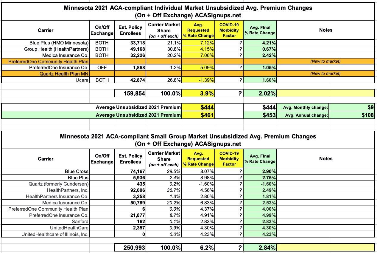 Minnesota: APPROVED avg. 2021 #ACA premiums: +2.0% indy, +2.8% sm. group