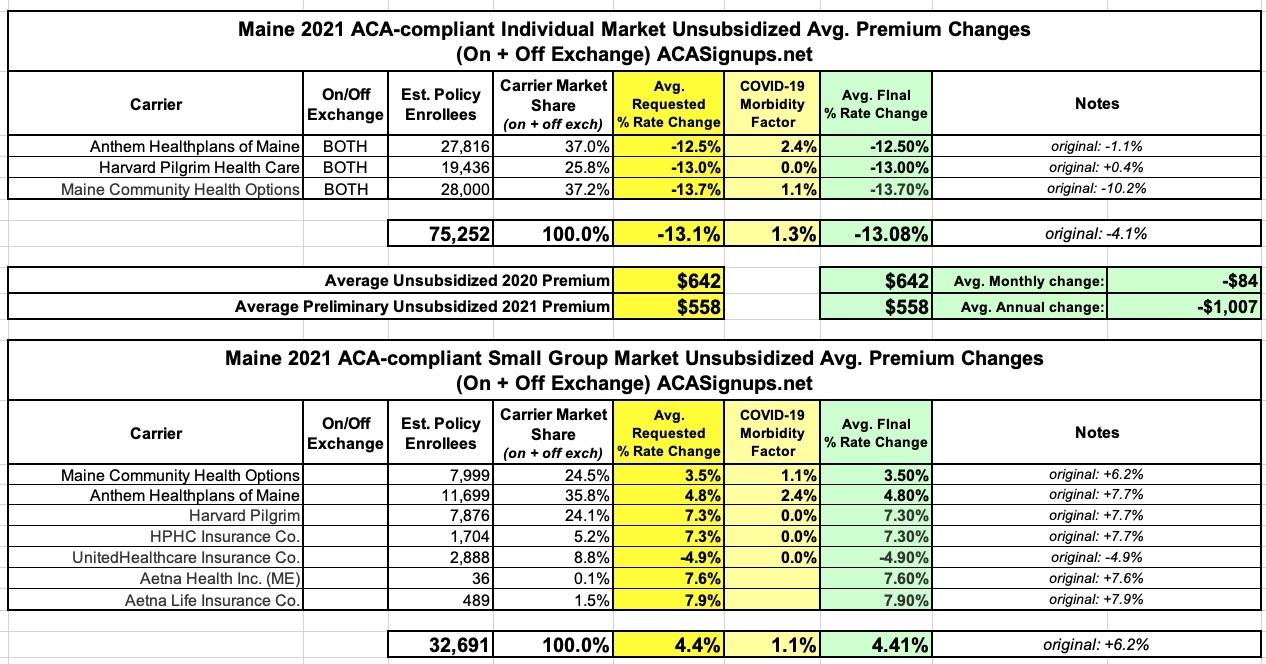 Maine: Revised 2021 #ACA premiums: 13.1% lower for indy market, 4.4% higher for small group plans