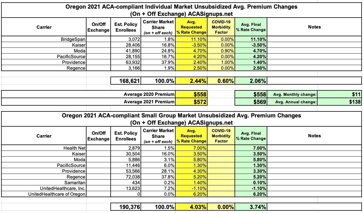 Oregon: Final avg. 2021 ACA rate change: +2.1%; +3.7% for sm. group