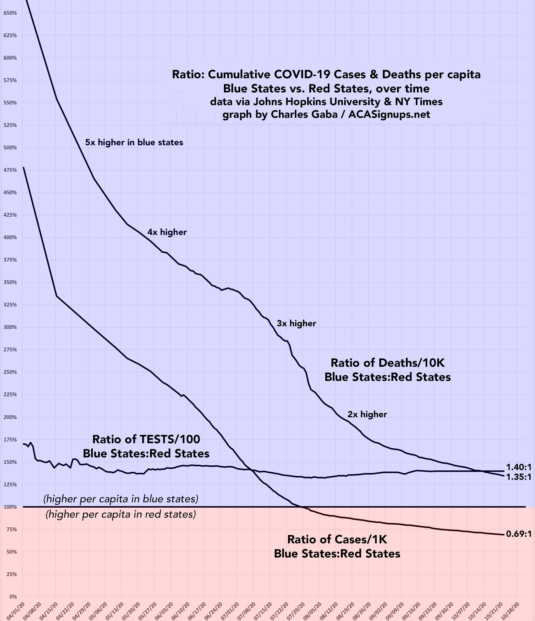 Also, note again that the higher case rate isn't because the red states are testing at a higher rate--it's actually the blue states which have been testing at a much higher rate all along...averaging roughly 40% more testing per capita every day.