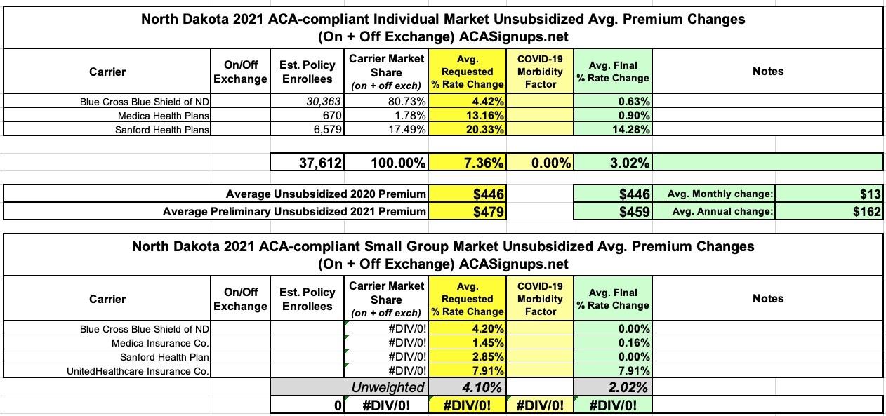 North Dakota: *Approved* avg. 2021 #ACA premiums: +3.0% indy market, +2.0% sm. group
