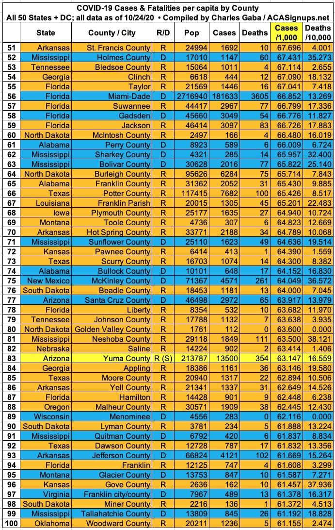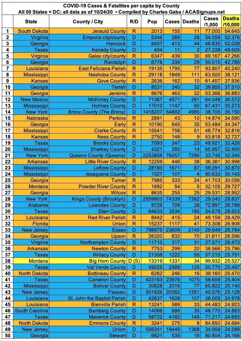 Here's the top 100 counties ranked by per capita COVID-19 fatalities as of Saturday, October 24th (click image for high-res version):