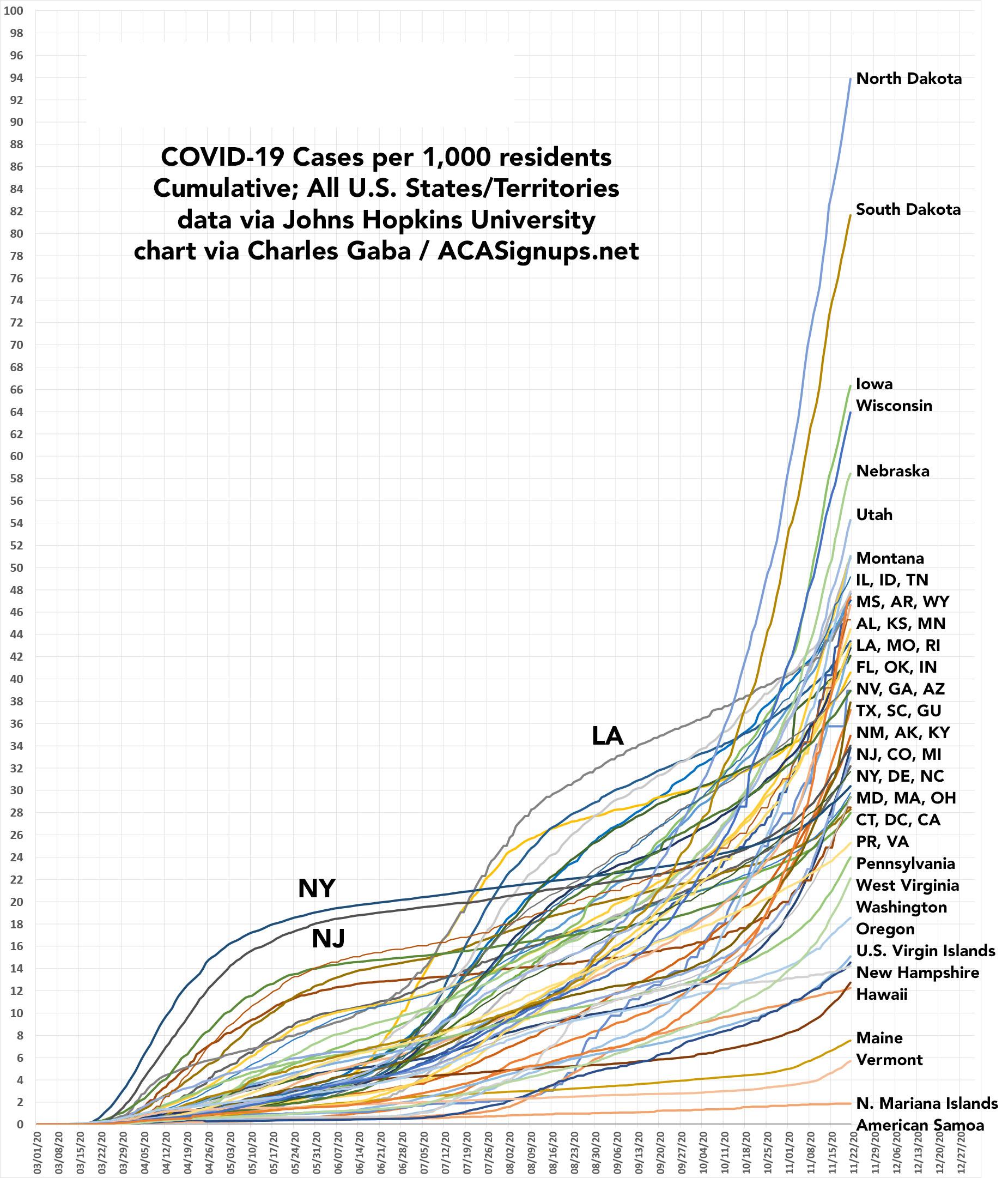 I've done my best to label every state/territory, which obviously isn't easy to do for most of them given how tangled it gets in the middle. The most obvious point is that New York and New Jersey, which towered over every other state last spring, are now utterly dwarfed by North & South Dakota, which are skyrocketing.