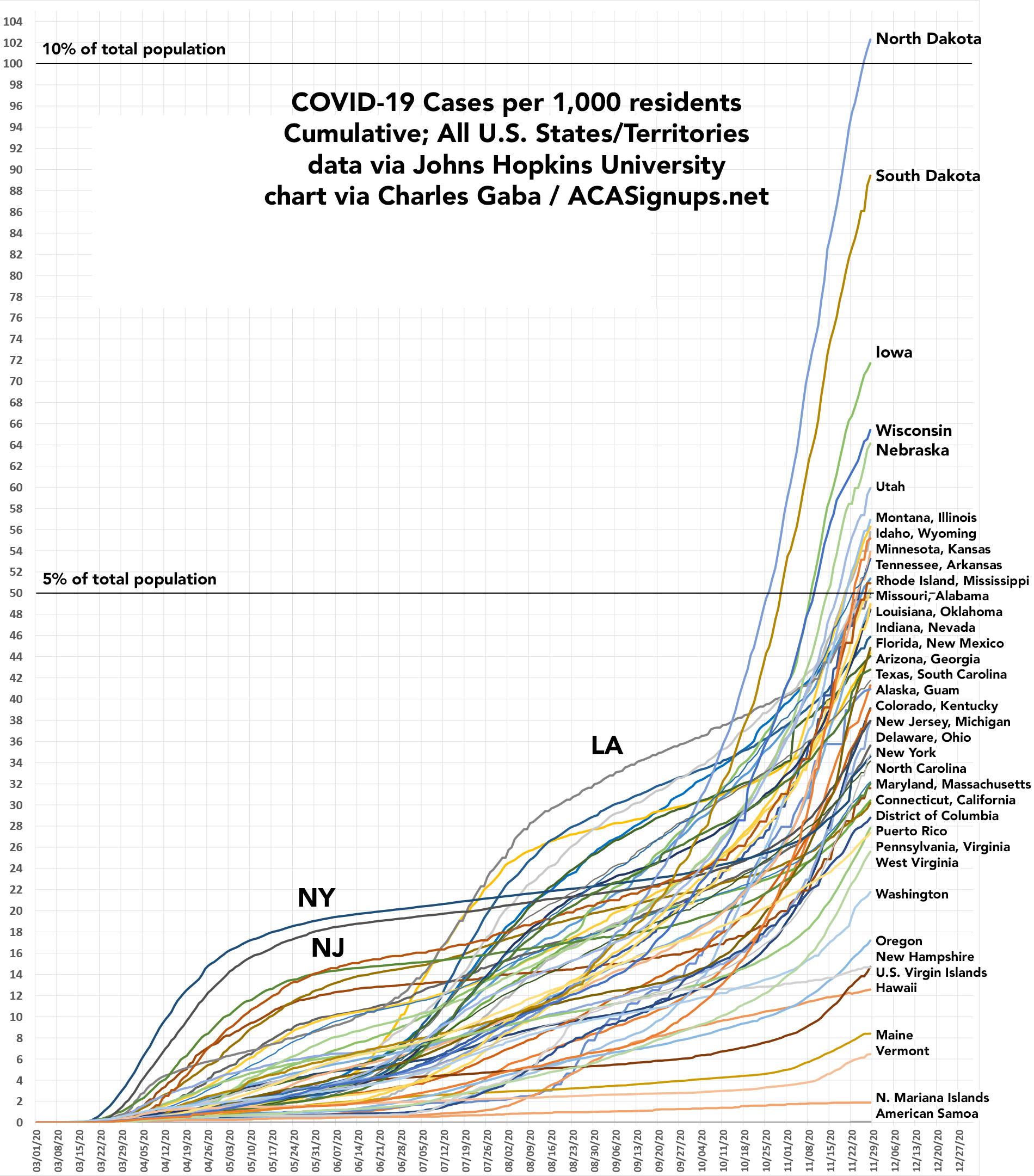 I've done my best to label every state/territory, which obviously isn't easy to do for most of them given how tangled it gets in the middle. The most obvious point is that New York and New Jersey, which towered over every other state last spring, are now utterly dwarfed by North & South Dakota, which are skyrocketing.