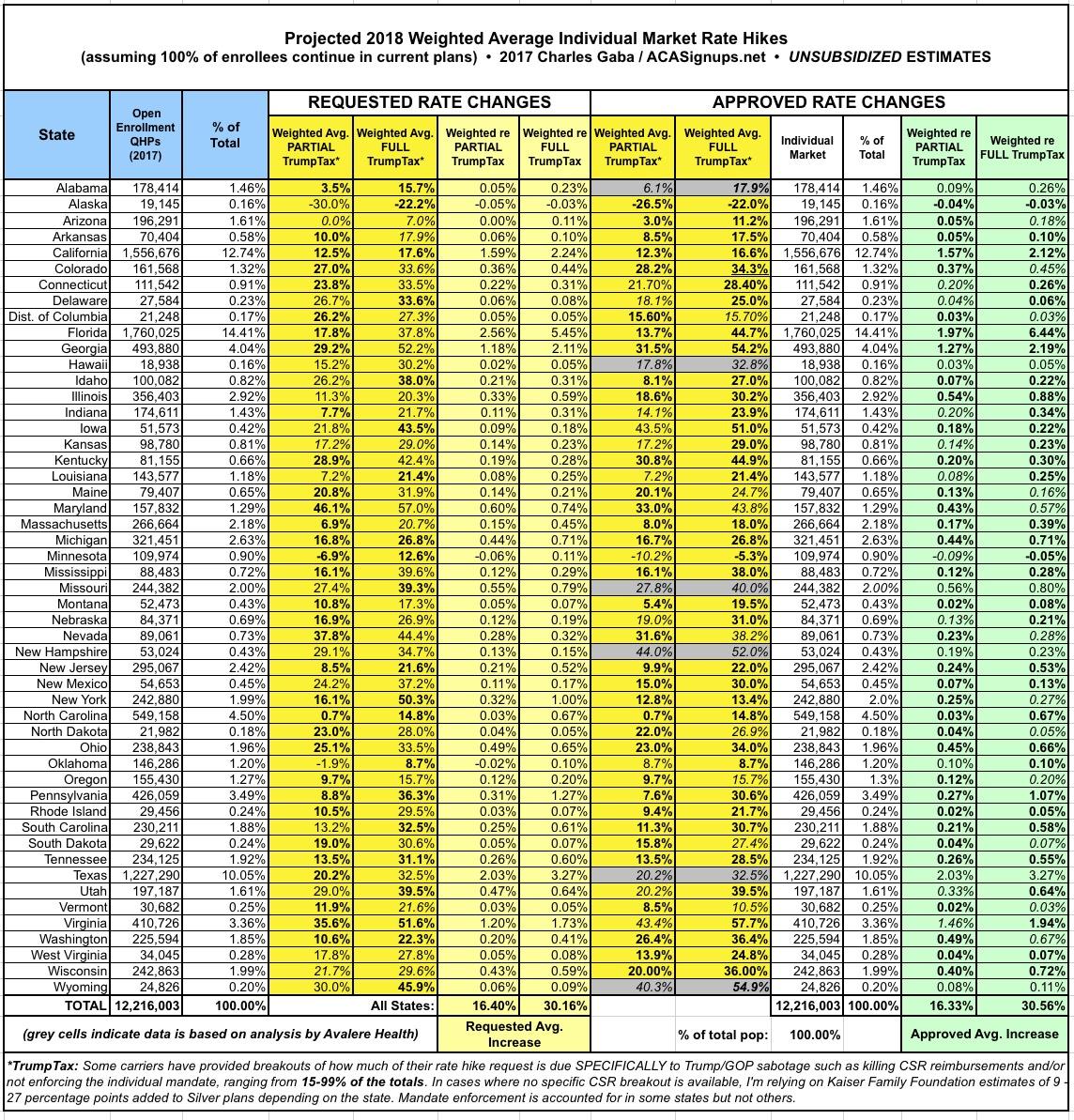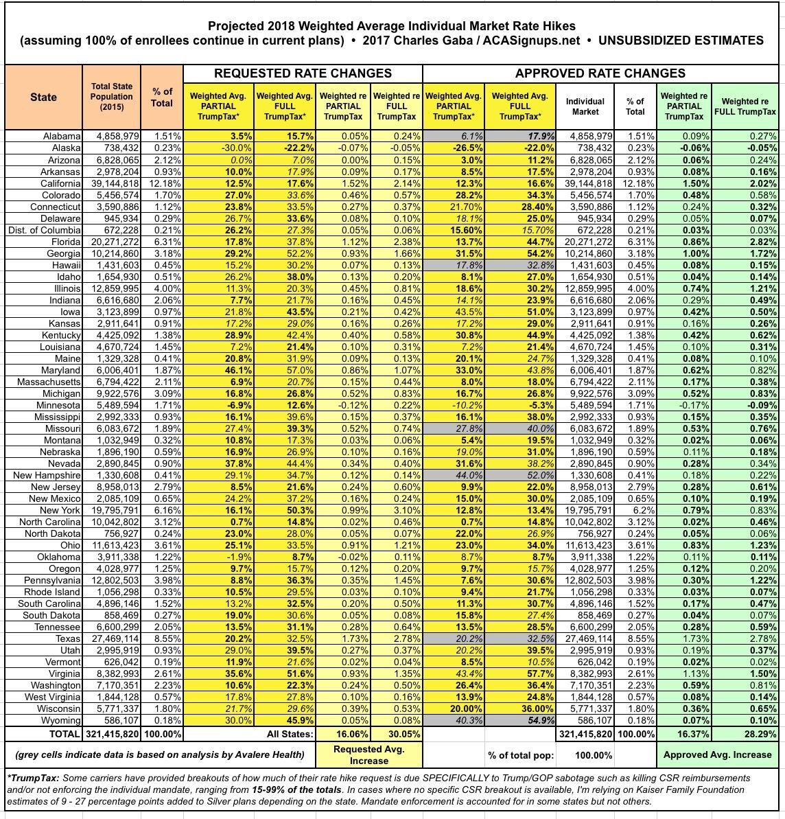 UPDATE 8/1/17: Well, the floodgates have really opened up today (especially with RateReview.HealthCare.Gov being loaded up for 2018). I've also added ALABAMA, ALASKA and WYOMING. Across 28 states representing I've now tracked 28 STATES representing 53% of the population, with weighted average requested rate hikes of up to 13.2% with NO or PARTIAL Trump/GOP sabotage included, or around 28.1% with the FULL sabotage tax: