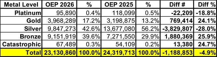 Finally, Gold plan enrollment, which I was expecting would also drop, actually increased in both raw numbers as well as as a percentage of the total, from 13.2% to 17.2% of all 2026 OEP plan selections...again for reasons I'll discuss soon.