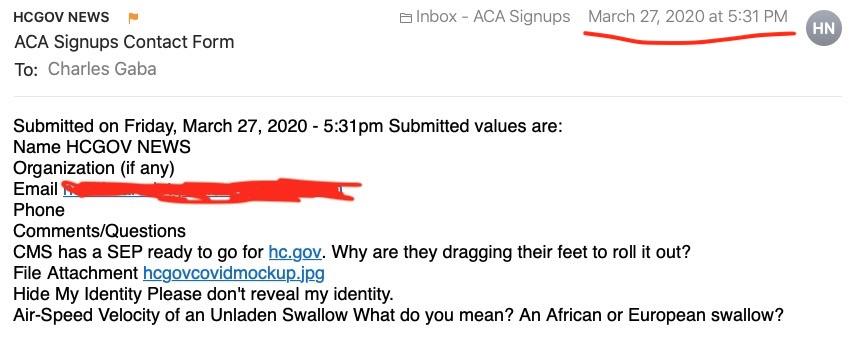 Assuming it's legitimate, HealthCare.Gov was indeed planning on launching a 4-week "open" COVID-19 SEP as of March 27th...only to kill it over the weekend. That's not very long, but they could have easily bumped out the deadline by another month or two as many of the state exchanges ended up doing. As I've noted repeatedly, based on the data from the state-based exchanges which have launched COVID SEPs, an additional 220,000 - 320,000 Americans likely would have enrolled if they had done so (I actually projected 440K - 640K for a 2- month SEP).