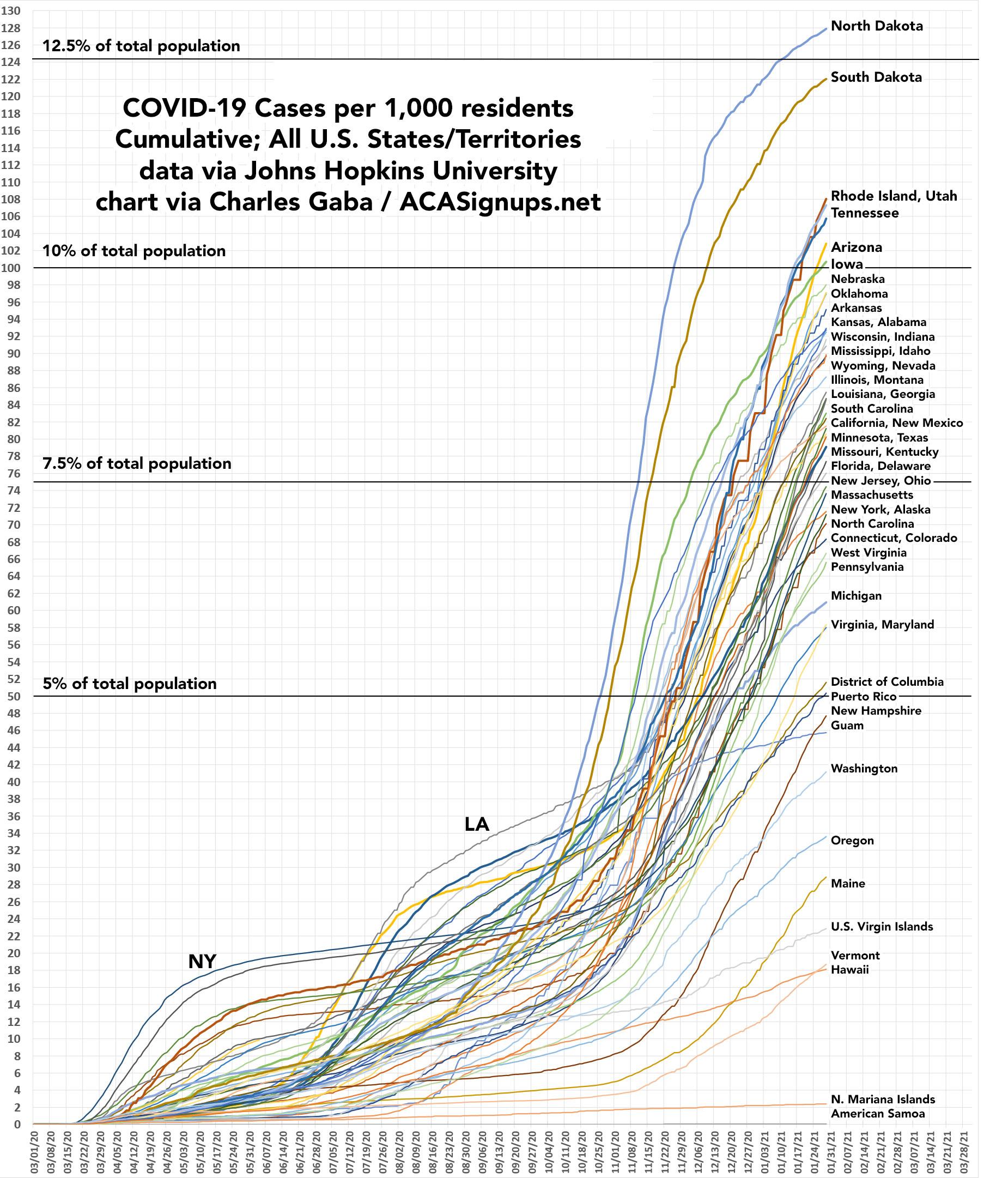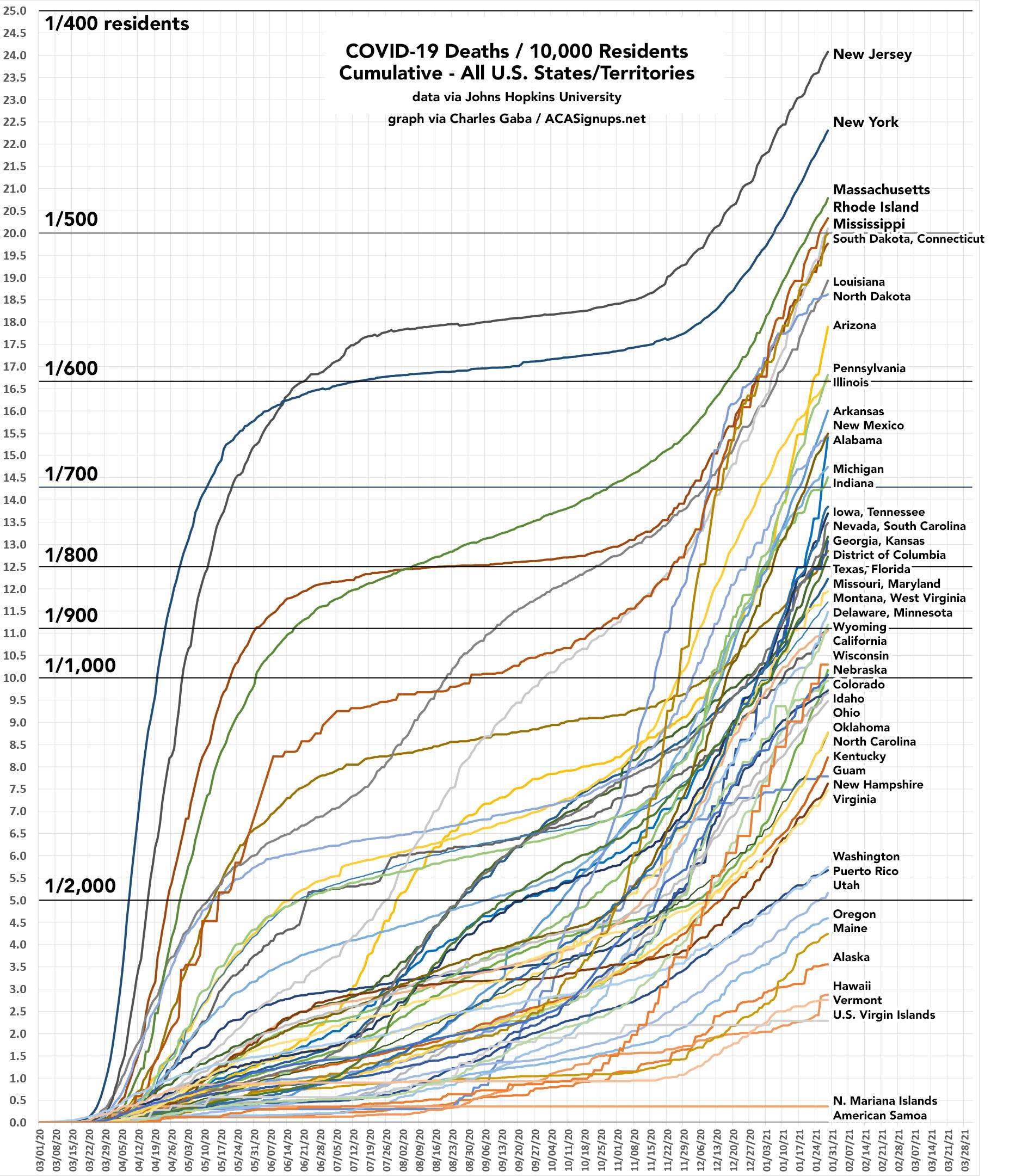 I've done my best to label every state/territory, which obviously isn't easy to do for most of them given how tangled it gets in the middle. For cases per capita, the most obvious point is that New York and New Jersey, which towered over every other state last spring, are now utterly dwarfed by North & South Dakota, although things are getting pretty horrible everywhere now.