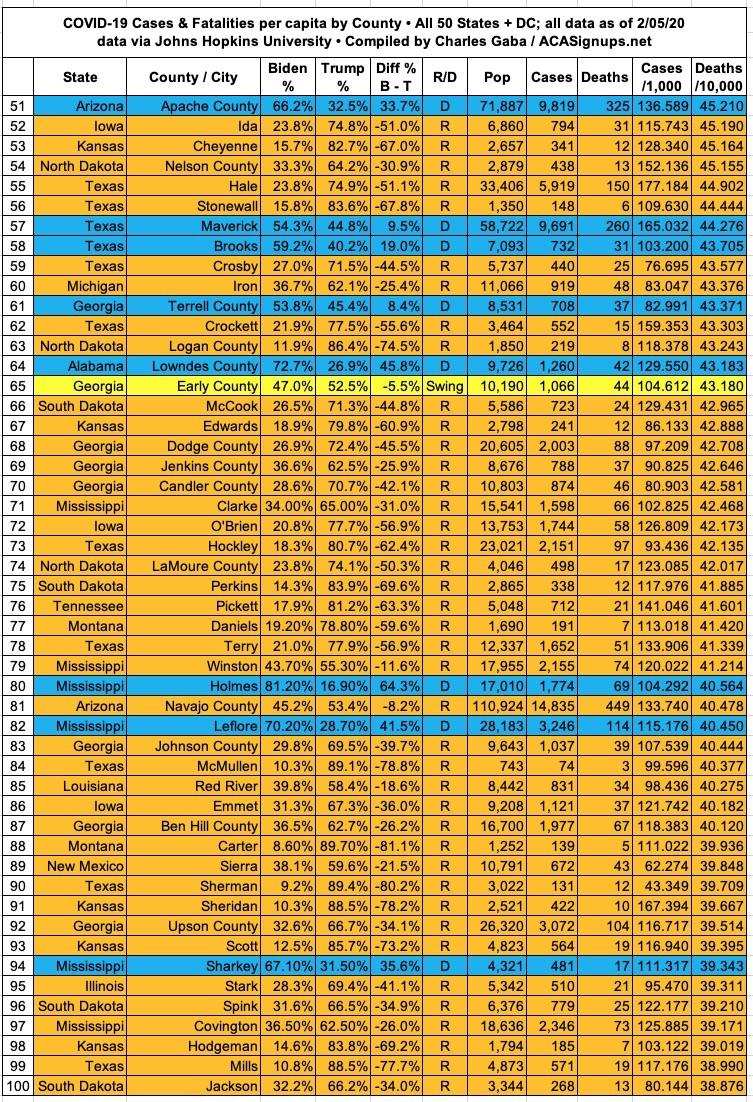 Here's the top 100 counties ranked by per capita COVID-19 fatalities as of Friday, February 5th, 2021 (click image for high-res version):