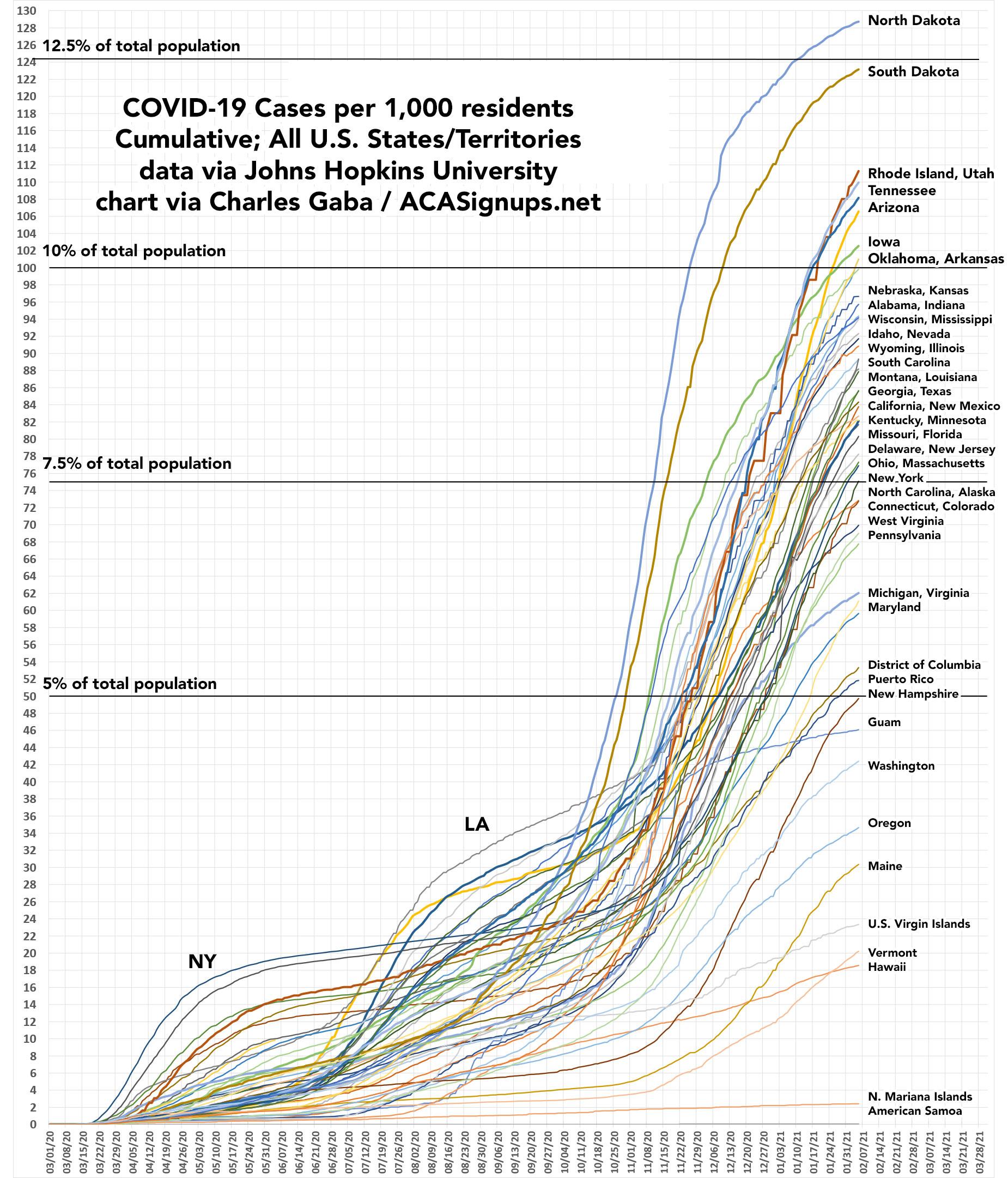 I've done my best to label every state/territory, which obviously isn't easy to do for most of them given how tangled it gets in the middle. For cases per capita, the most obvious point is that New York and New Jersey, which towered over every other state last spring, are now utterly dwarfed by North & South Dakota, although things are getting pretty horrible everywhere now.