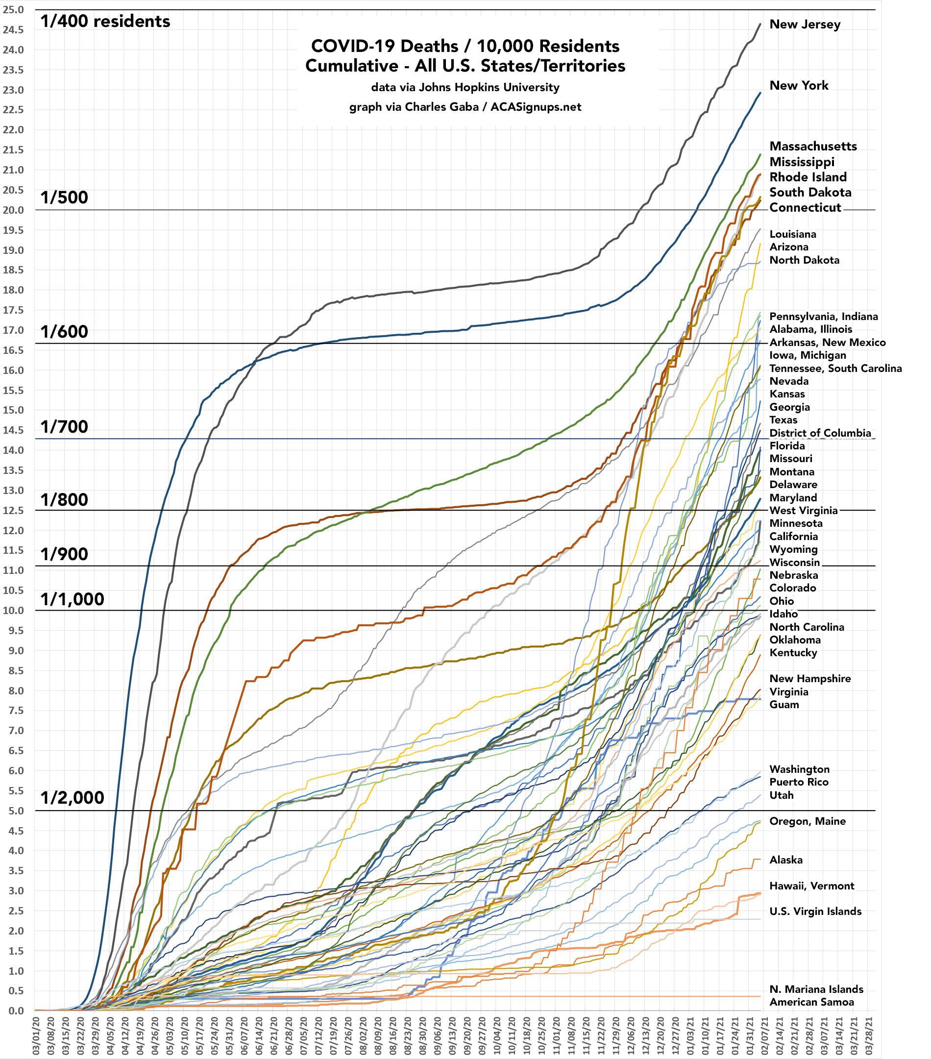 Next, let's look at the cumulative mortality rate for every U.S. state and territory. Here, New Jersey and New York are still worse than the rest of the country (primarily due to their mass deaths from March - May this past spring)...but as you can see, several other states are, tragically, also catching up to them on this front as well.