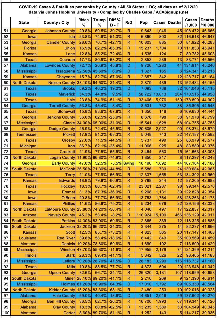 Here's the top 100 counties ranked by per capita COVID-19 fatalities as of Friday, February 12th, 2021 (click image for high-res version):