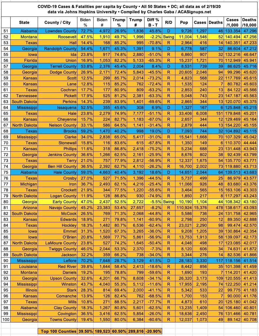 Here's the top 100 counties ranked by per capita COVID-19 fatalities as of Friday, February 19th, 2021 (click image for high-res version):