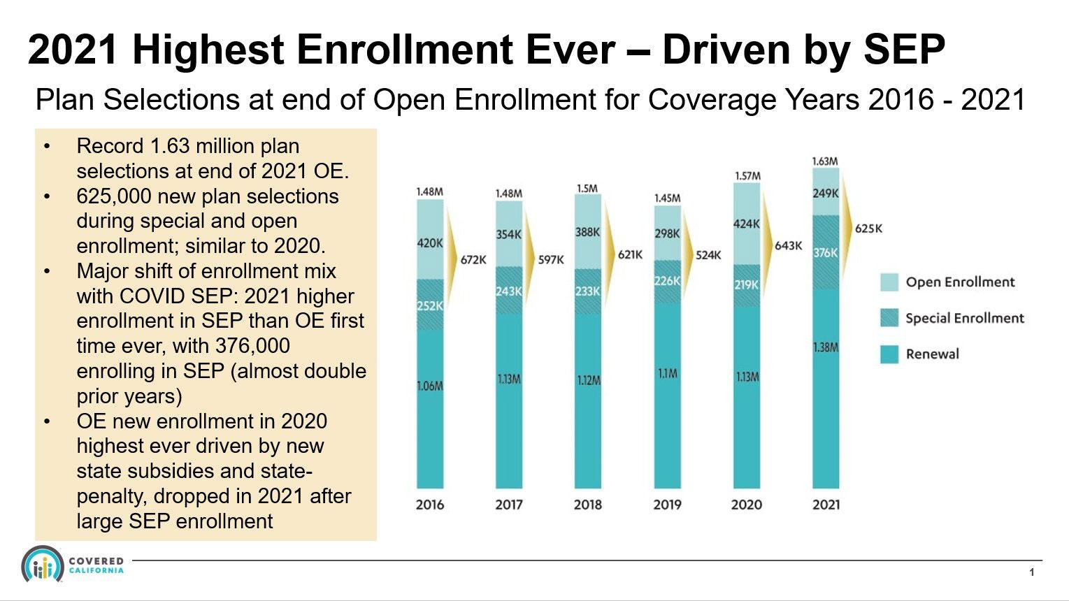 • Of those, 1.38 million (around 85%) were existing CoveredCA enrollees who renewed their policies (including 376,000 who had enrolled via Special Enrollment Periods)