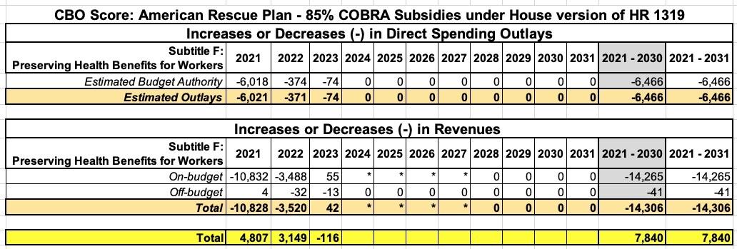 Under the House ARP bill, employers would be required to continue to pay 85% of those same premiums for up to six months (April - September 2021), with the government reimbursing the employer for that amount. (Note: The final Senate version of the bill increased the 6-month COBRA subsidies to a full 100%, which was reflected in a modified CBO score, but I'll get to that later).