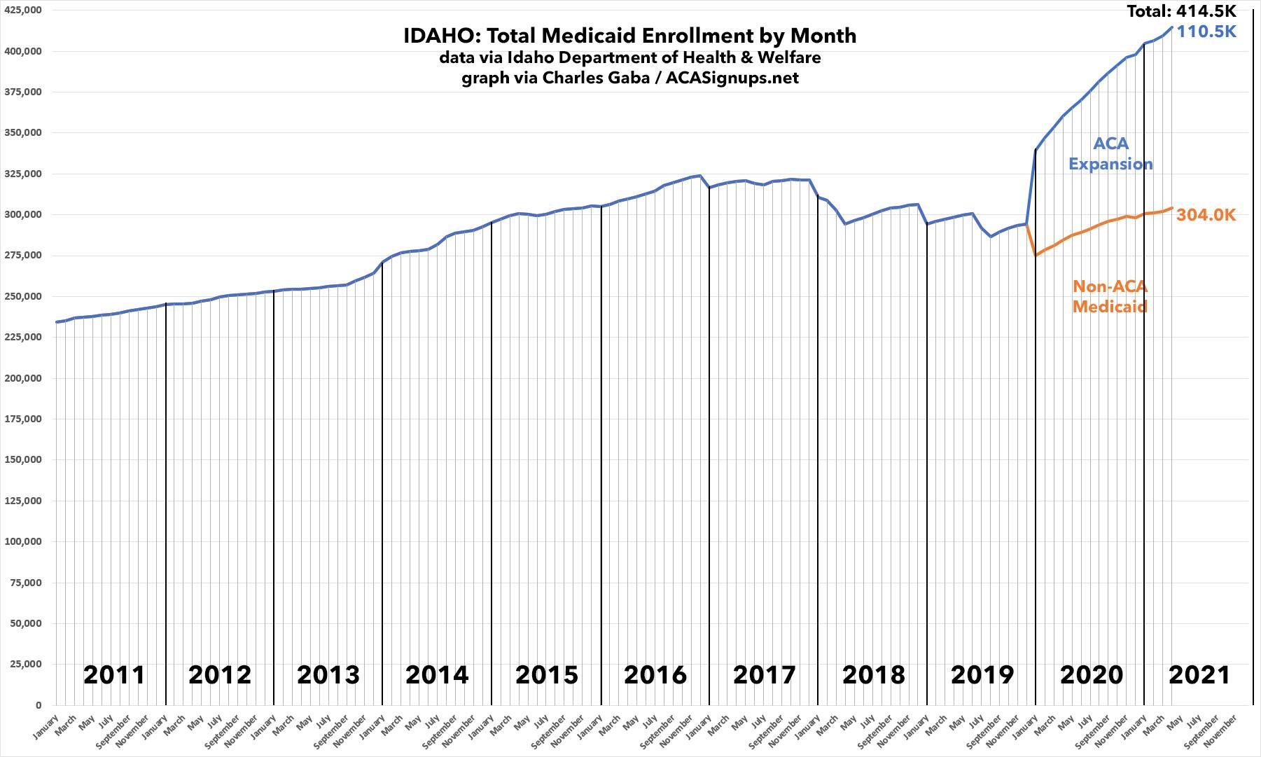 I've relaunched my project to track Medicaid enrollment (both standard and expansion alike) on a monthly basis for every state dating back to the ACA being signed into law (where possible). Today I'm presenting Idaho, where you can see the dramatic difference in covering low-income residents which ACA Medicaid expansion has made...and just in the nick of time, seeing how the COVID pandemic struck the U.S. just a month or two after Medicaid expansion went into effect.