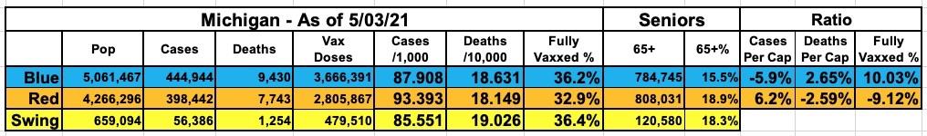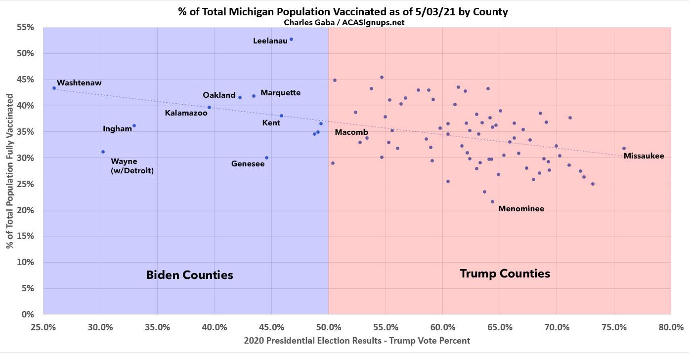 On the vaccine front, meanwhile...yep, as of today, Michigan's handful of large Blue counties (the 12 counties which voted for Biden last fall have 55% of the population) have vaccinated 36.2% of their residents, while the other 71 Trump-voting counties have only vaccinated 32.9% of theirs.