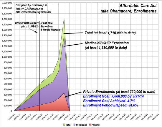All that being said, the current tally for actual enrollments now stands at at least 330,000, plus an additional 1.38 million Medicaid/SCHIP expansion enrollees, for a total of at least 1.7 million people enrolled through the ACA total:
