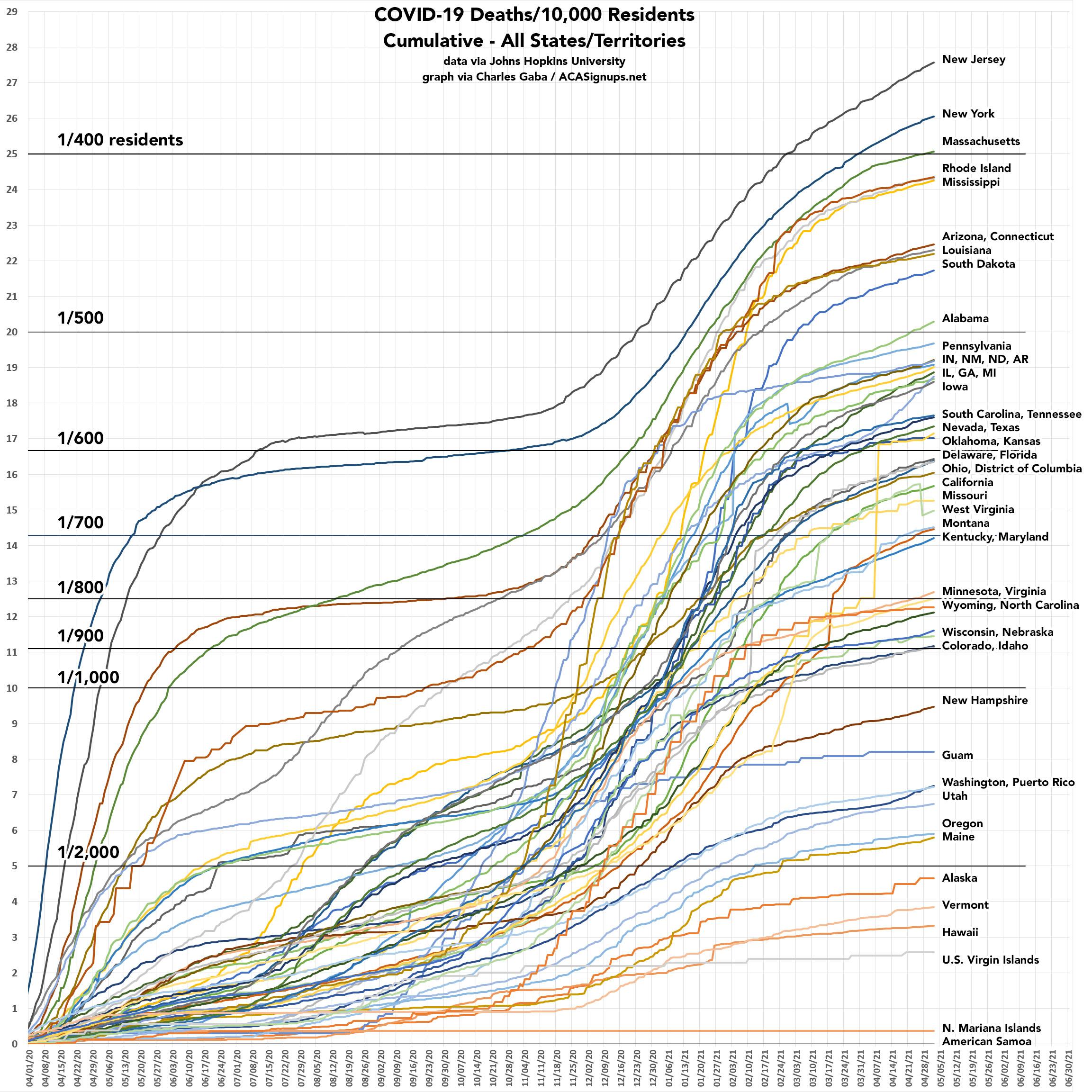 Next, let's look at the cumulative mortality rate for every U.S. state and territory. Here, New Jersey and New York are still worse than the rest of the country (primarily due to their mass deaths from March - May last spring)...but as you can see, several other states are, tragically, also catching up to them on this front as well.