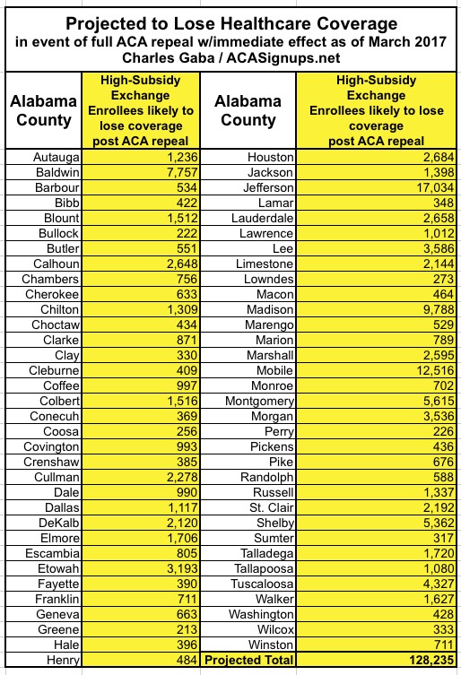In the case of Alabama, assuming 187,000 people* enroll in exchange policies by the end of January, I estimate around 134,000 of them would be forced off of their policy upon an immediate-effect full ACA repeal.