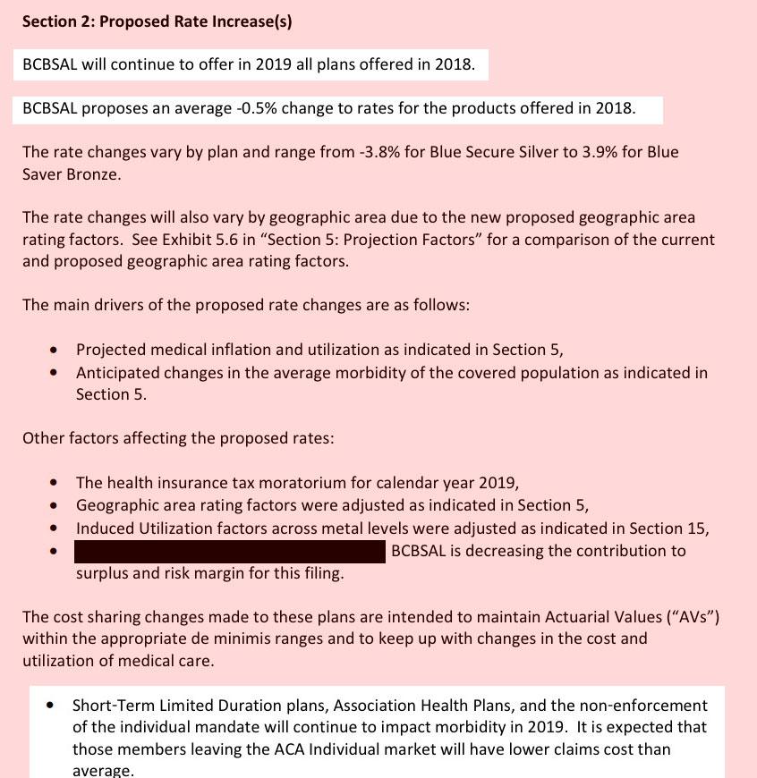 Assuming I'm close, however, unsubsidized Alabama residents should see their 2019 premiums drop by about 2% next year...except that they would be dropping substantially more if not for the mandate penalty being repealed and the expansion of #ShortAssPlans, as clearly noted in the filings for both companies. The Urban Institute assumed a whopping 21.6% sabotage tax, but I'm knocking 1/3 off that to be cautious and assuming "only" 14.4%. If so, that means unsubsidized Alabama enrollees will be paying nearly $1,200 more apiece next year than they should be: