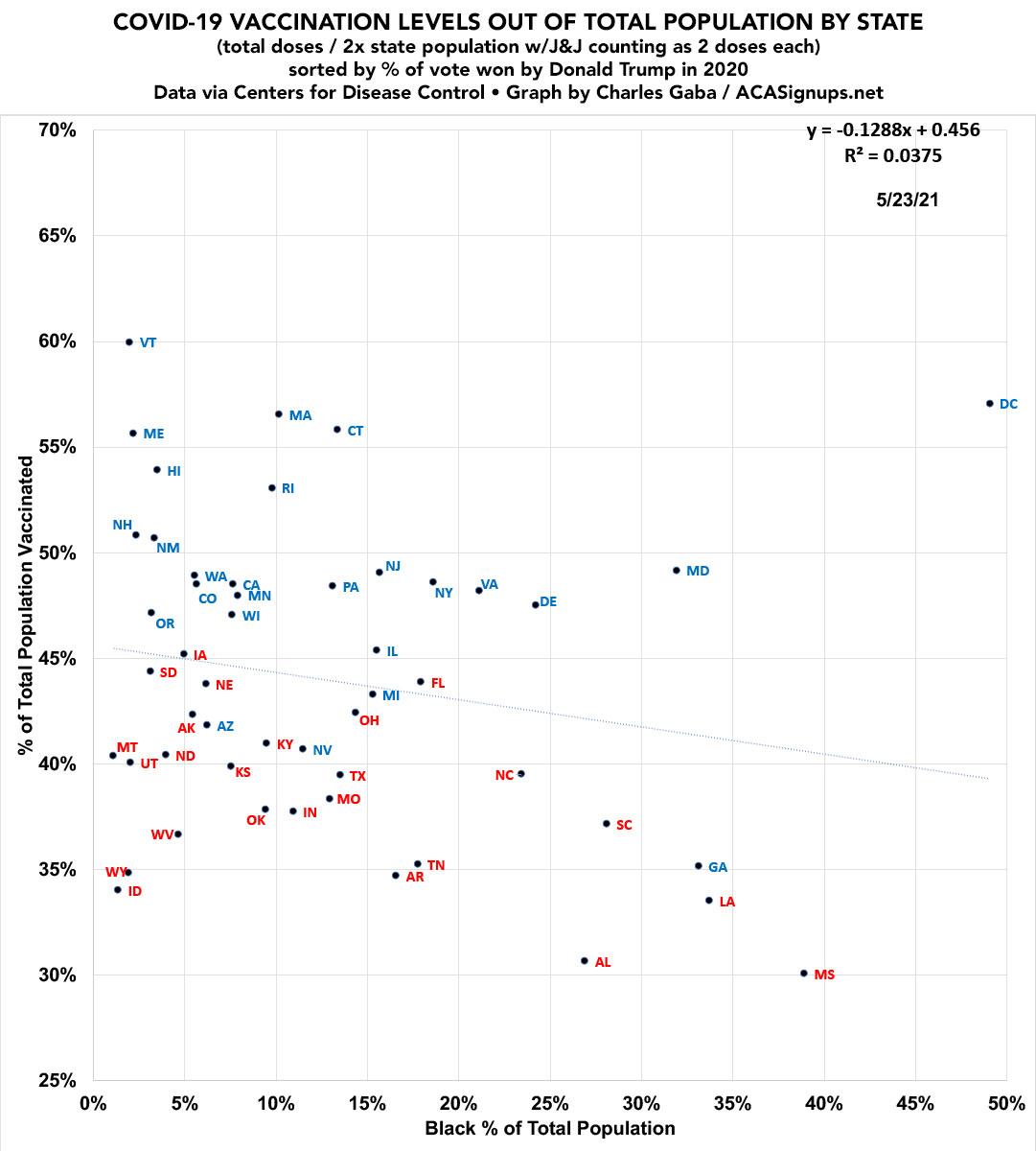 I've also plugged in a RACIAL DEMOGRAPHIC version based on the percent of each state's popualtion which is Black, according to 2018 Census Bureau estimates (by way of BlackDemographics.com). Obviously there's also Hispanic, Native American, Asian American/Pacific Islanders etc, but this illustrates things the most clearly: