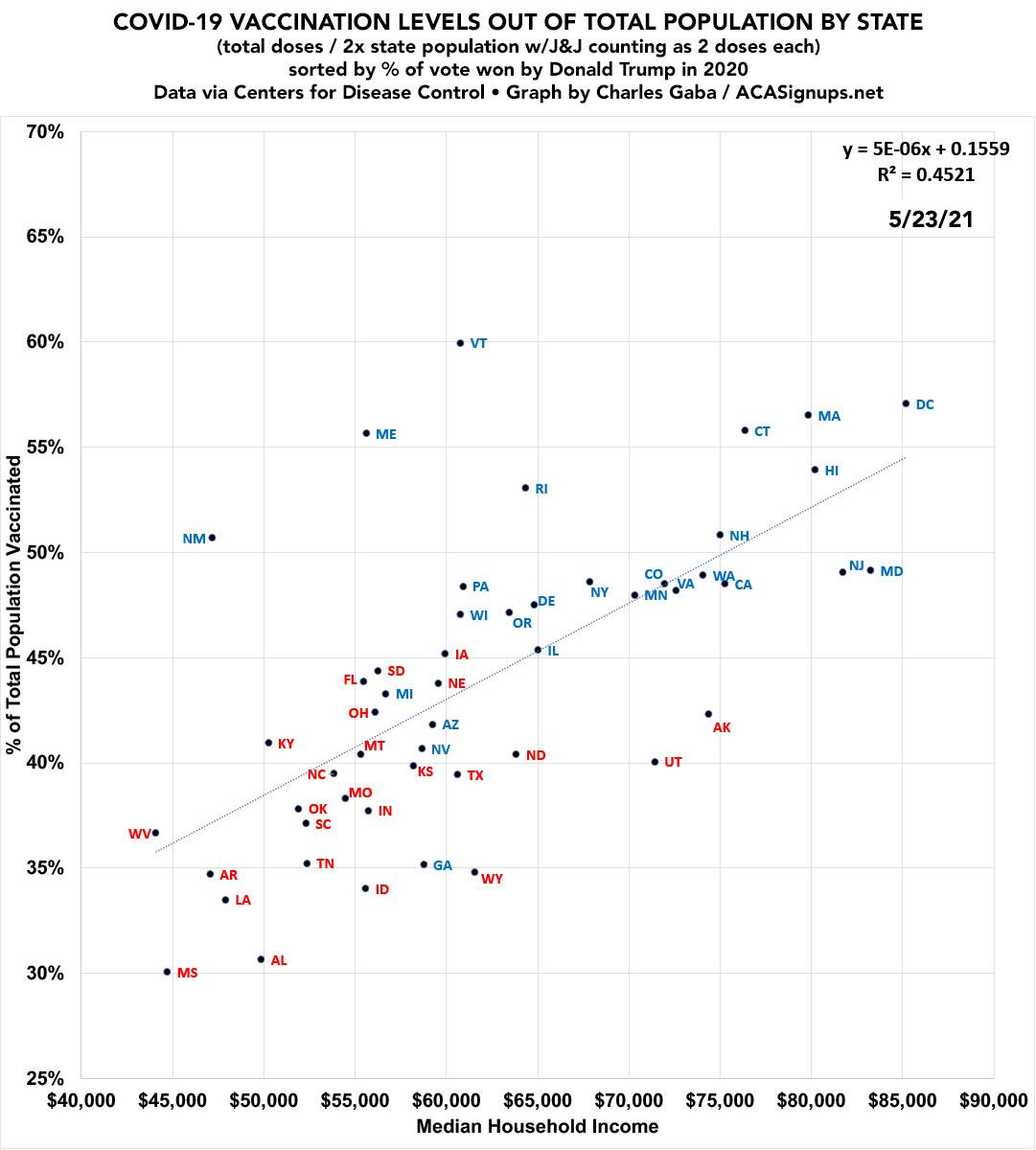 The vaccination levels for each state below are based on taking the total number of COVID-19 doses administered to date according to the Centers for Disease Control), then and dividing that into double the state population (since each person needs two doses to be fully vaccinated) as of April 2020 according to the U.S. Census Bureau.
