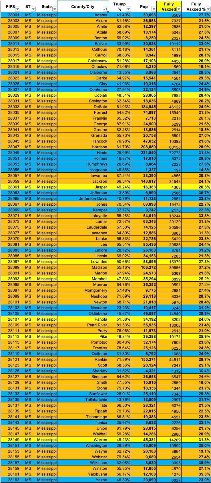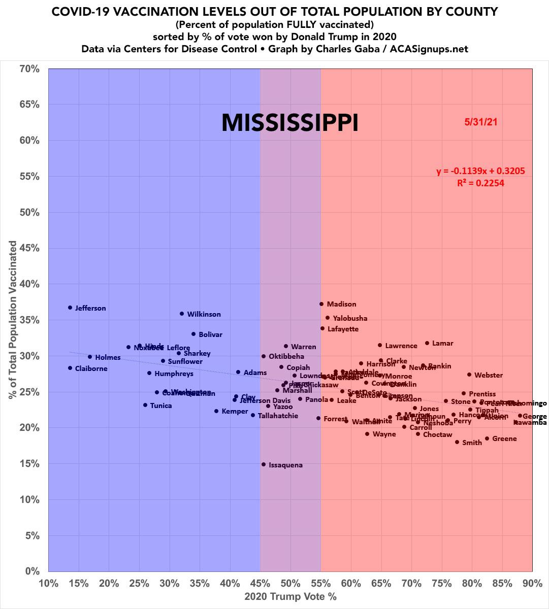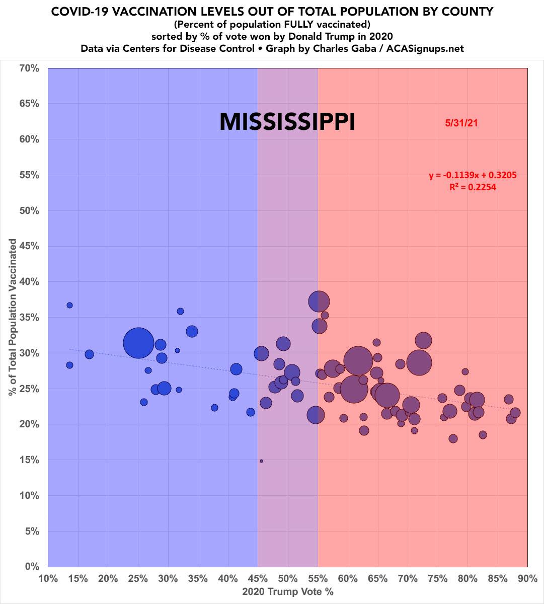 Mississippi: #COVID19 vaccination rates by county & partisan lean